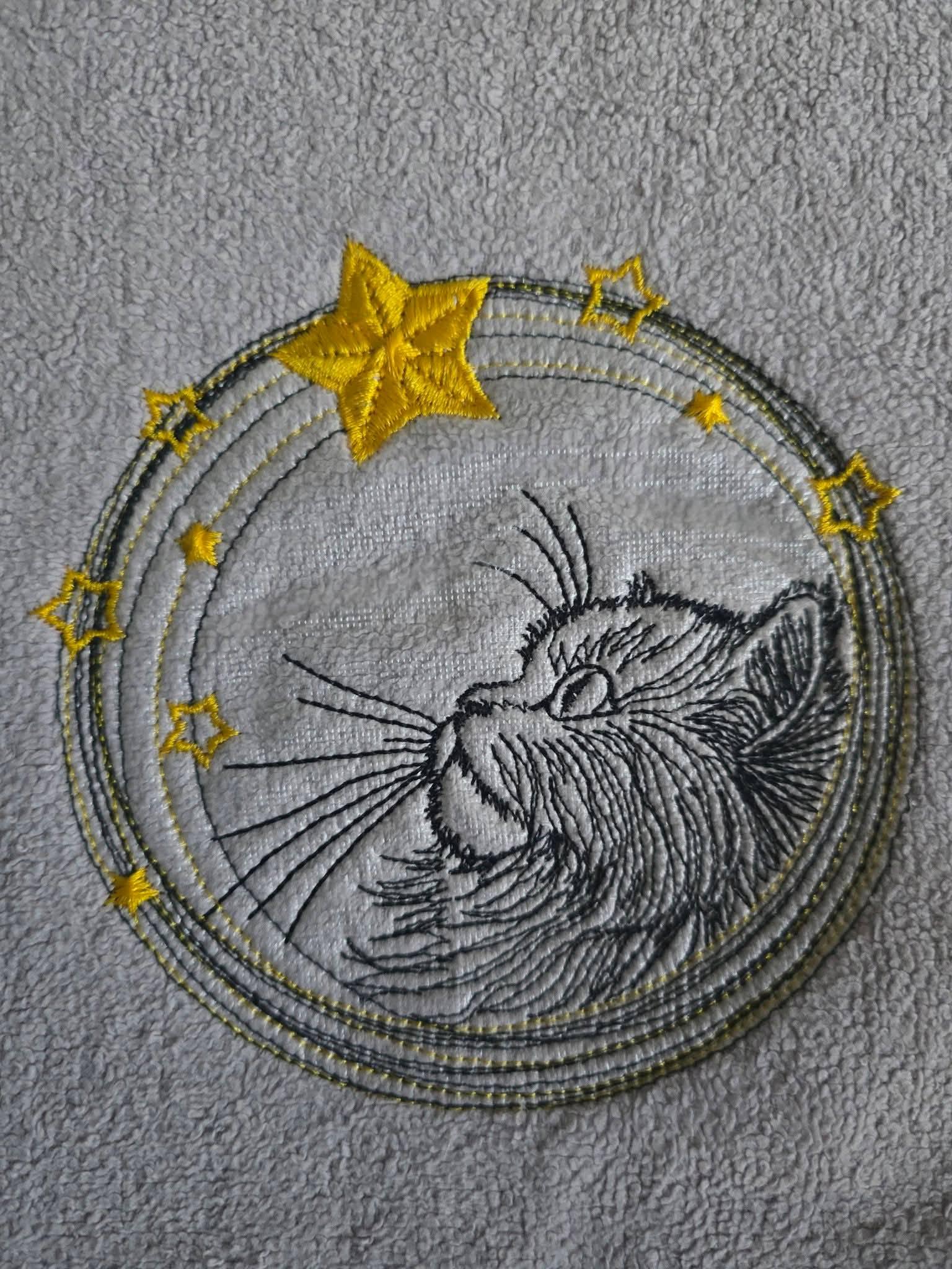 Bring the magic of the stars into your craft projects with this stunning "Celestial Cat" embroidery design! Perfect for cat lovers and stargazers alike, this design features a beautifully detailed cat gazing at the stars, surrounded by a circle of glowing golden stars. Ideal for adding a whimsical and elegant touch to your projects!