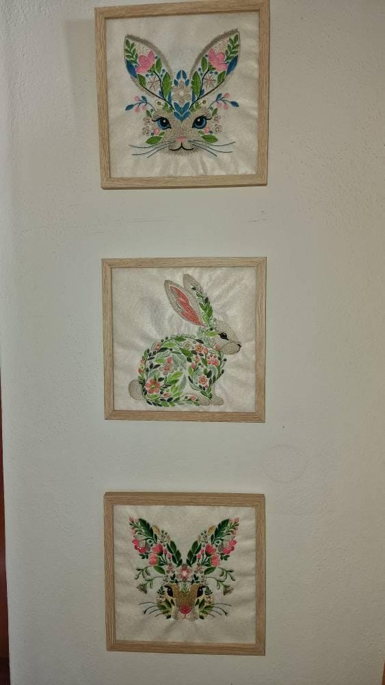 This stunning set of three floral bunnies is designed for machine embroidery. Each design features intricate botanical details, including leaves, flowers, and nature-inspired patterns, making it perfect for spring and Easter projects!