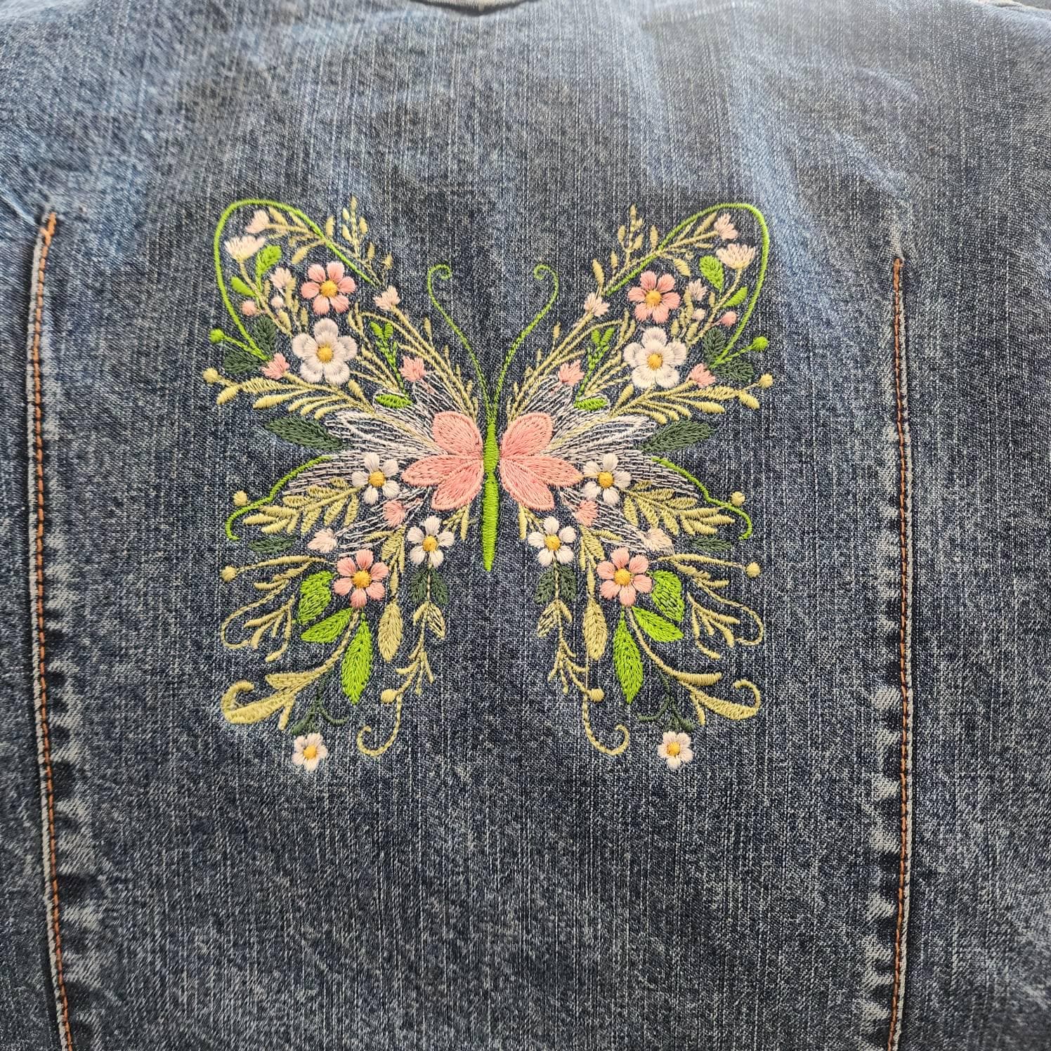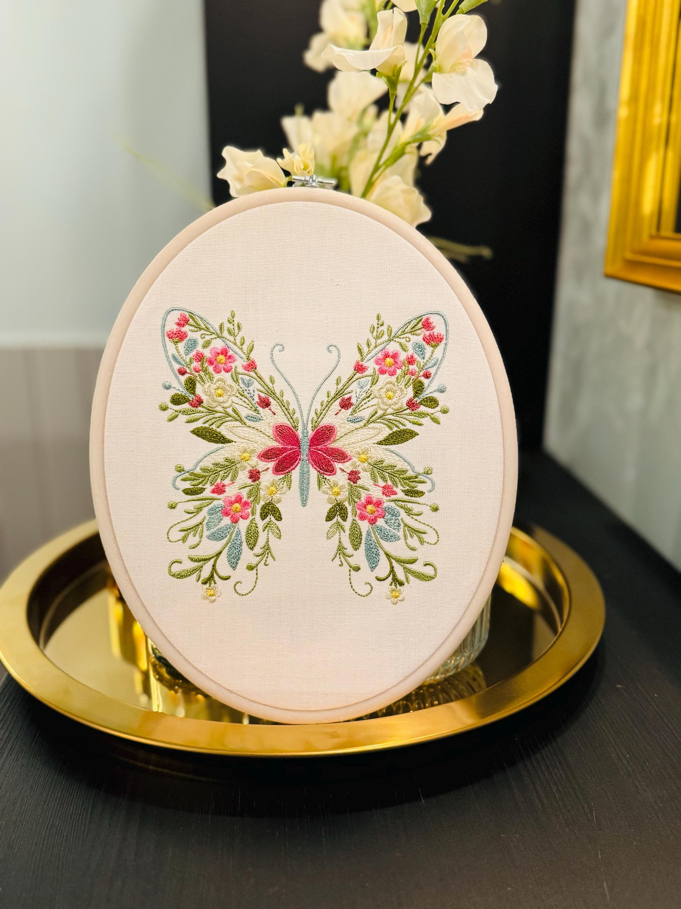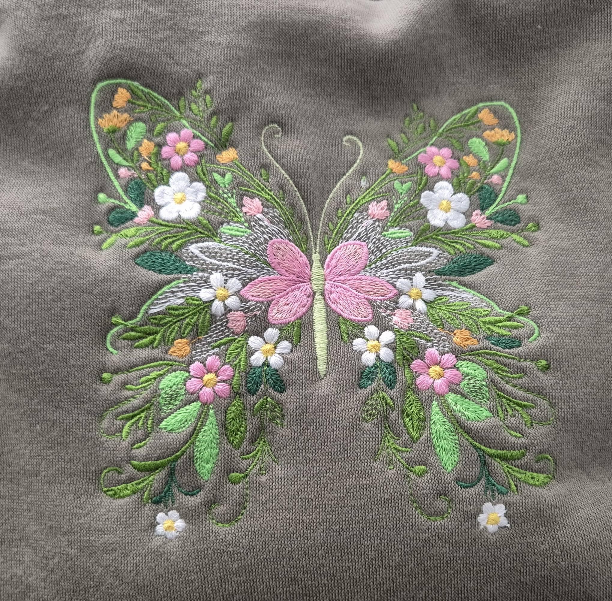 This detailed machine embroidery file features a butterfly with intricately woven flowers and leaves, ideal for clothing embellishment, home décor, gifts, hoop art, tote bags, jackets, cushions, and more!