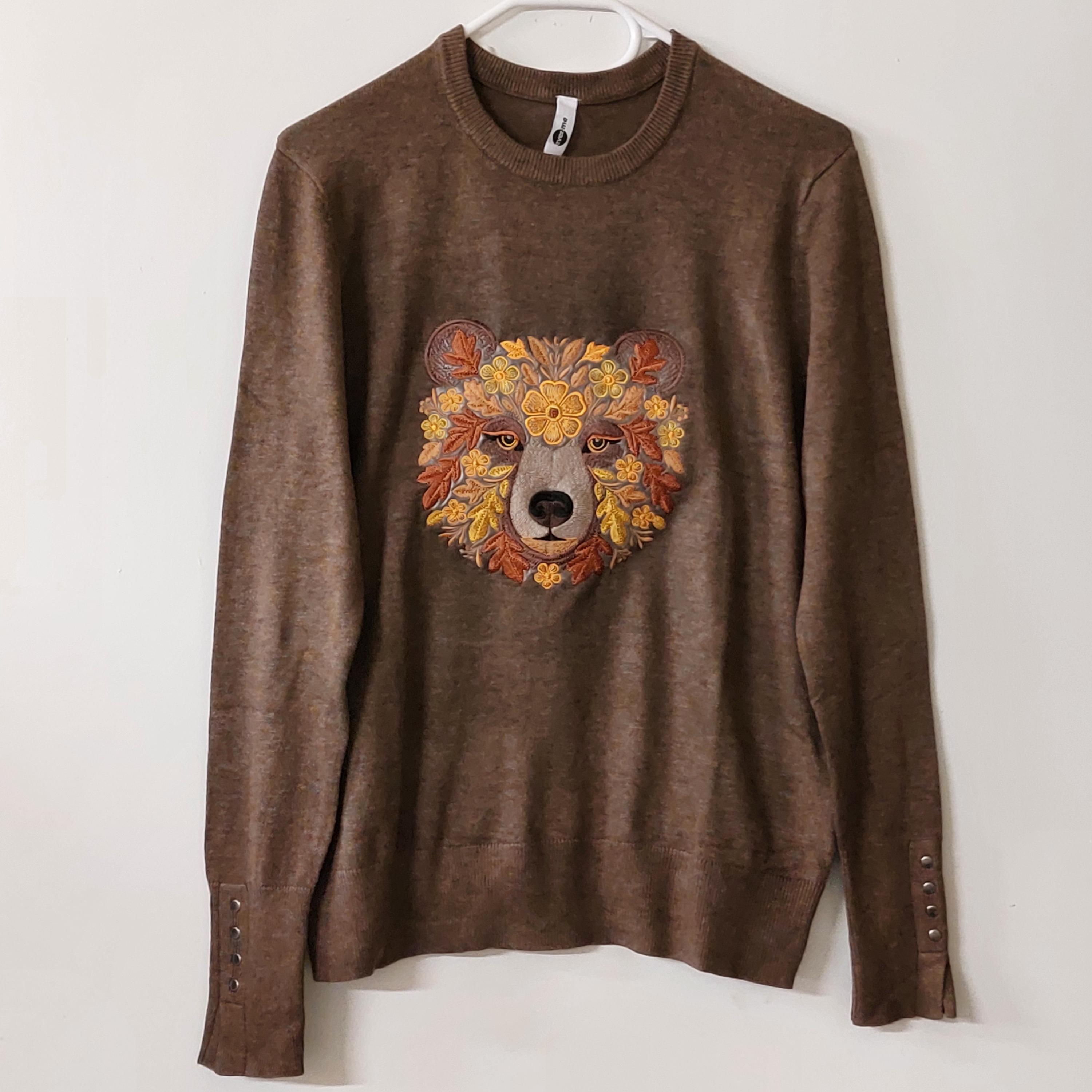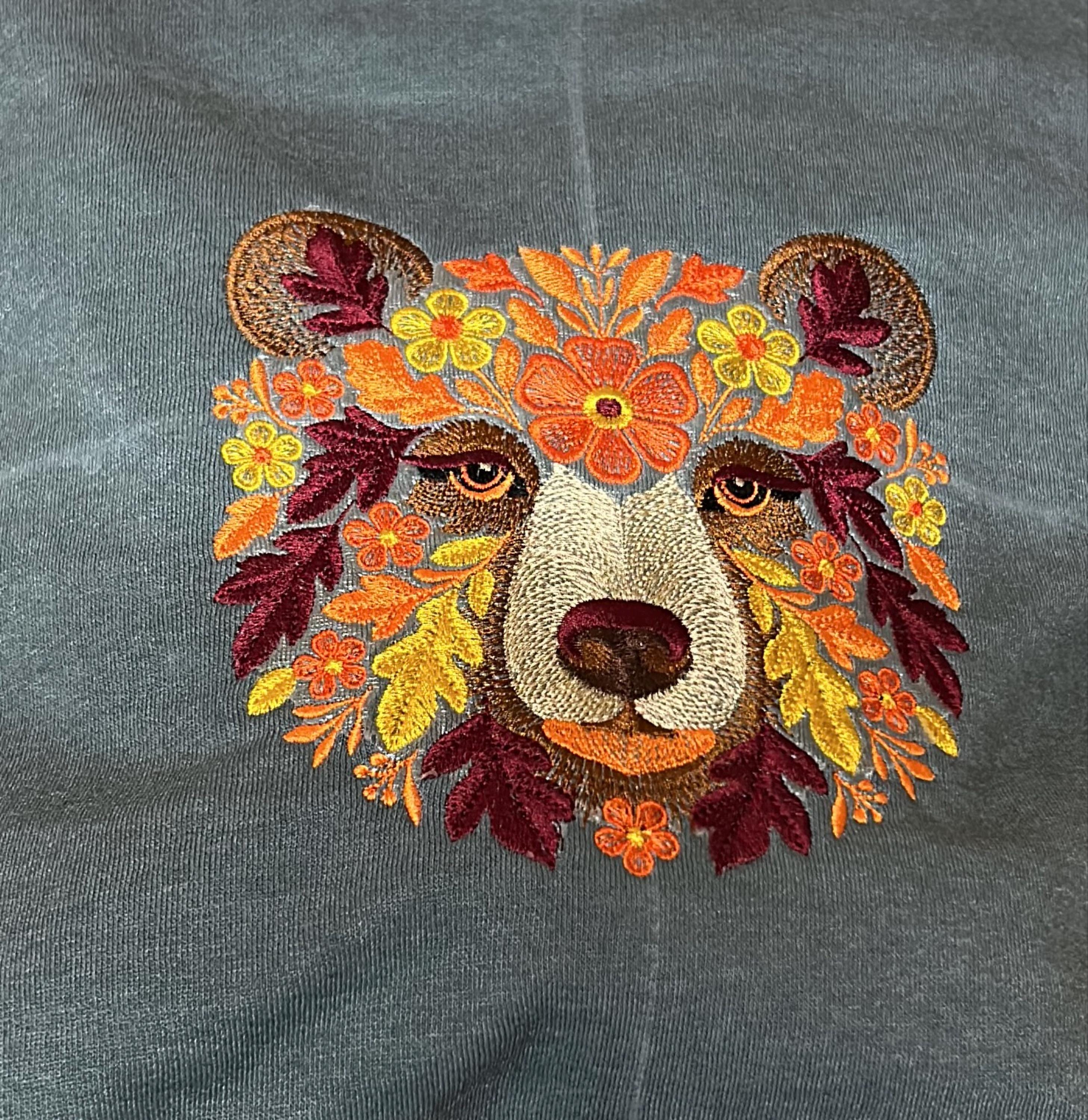 Bring the cozy charm of autumn into your embroidery collection with this highly detailed "Autumn Bear" machine embroidery design! Featuring a majestic bear face adorned with 🍁fall leaves, 🌼floral elements, and a warm autumnal color palette, this piece radiates woodland magic and seasonal elegance.