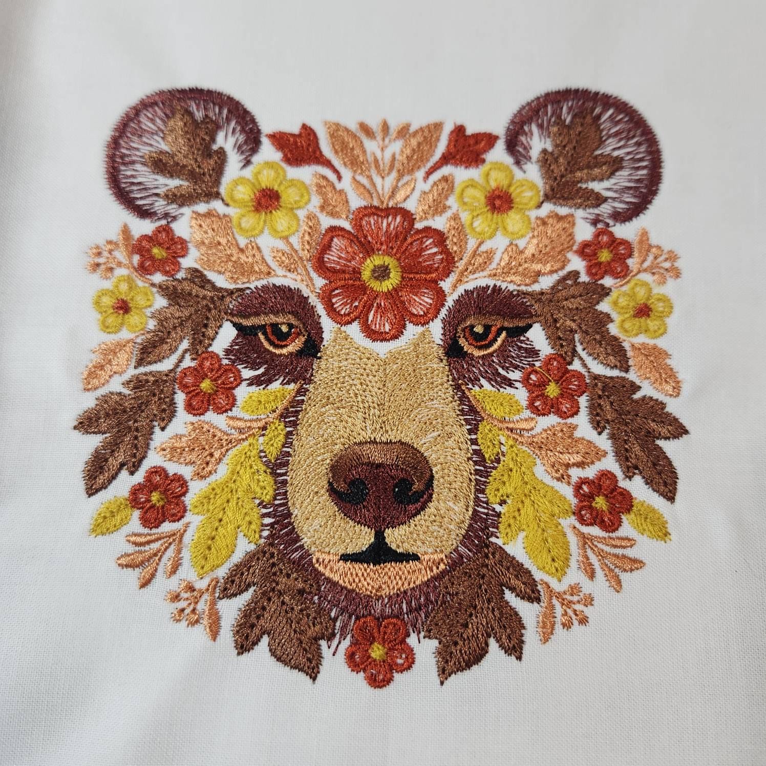Bring the cozy charm of autumn into your embroidery collection with this highly detailed "Autumn Bear" machine embroidery design! Featuring a majestic bear face adorned with πfall leaves, πΌfloral elements, and a warm autumnal color palette, this piece radiates woodland magic and seasonal elegance.