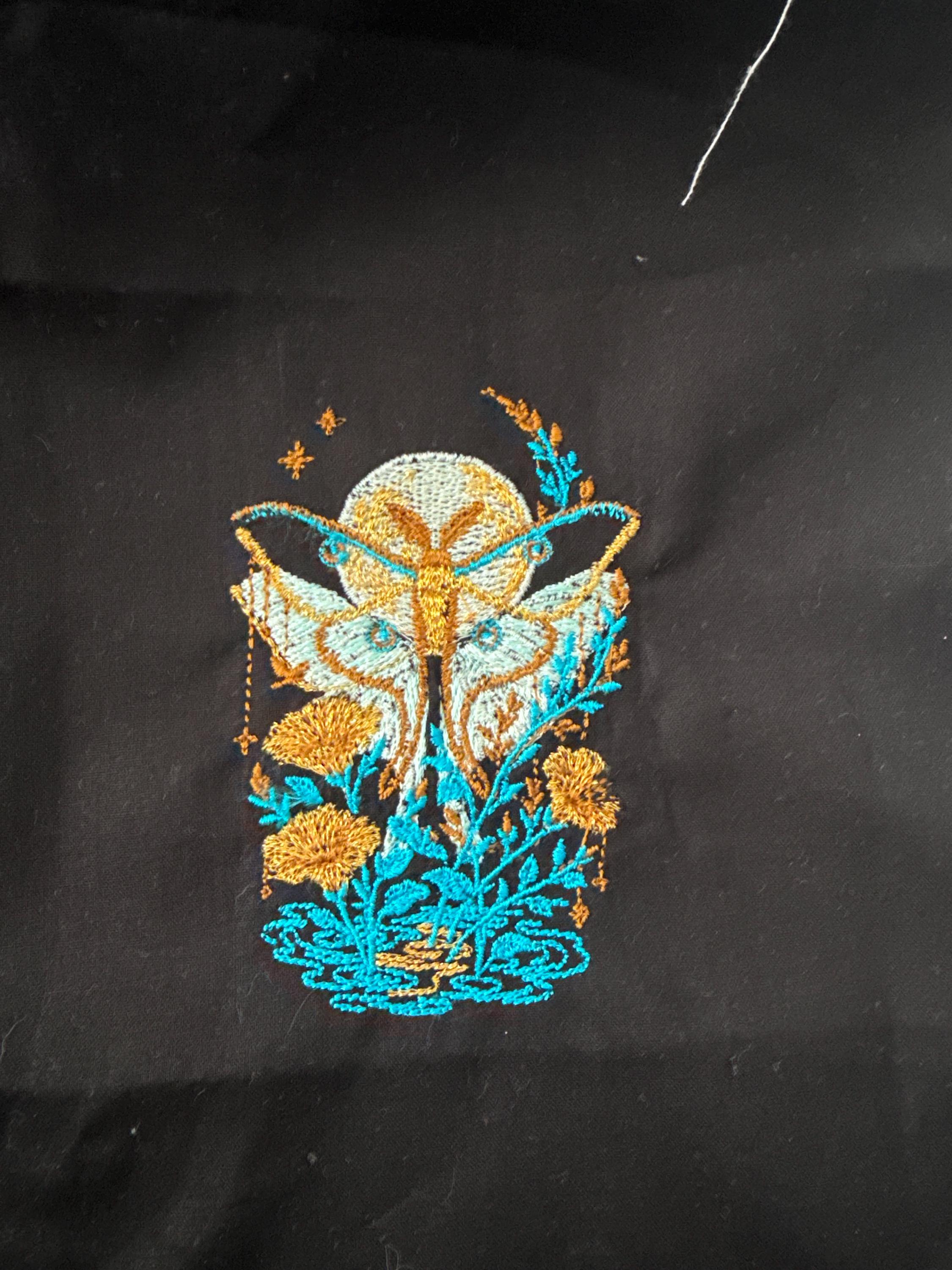 This elegant Moon Moth embroidery design combines celestial beauty and nature’s calm. The moth’s wings shimmer with gold and blue hues, surrounded by moonlight, stars, and delicate florals. A perfect piece for anyone who loves mystical, bohemian, and celestial-style embroidery.