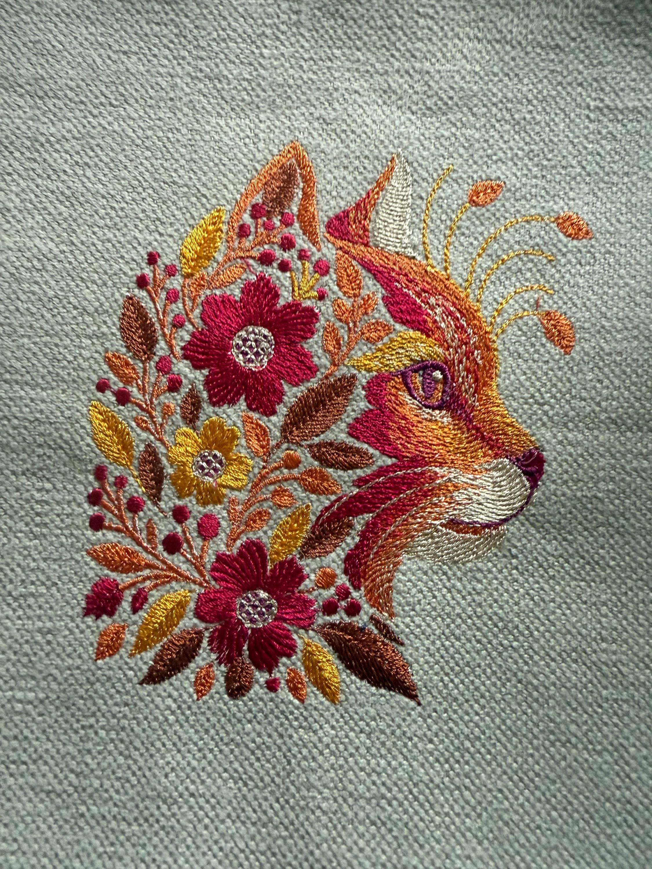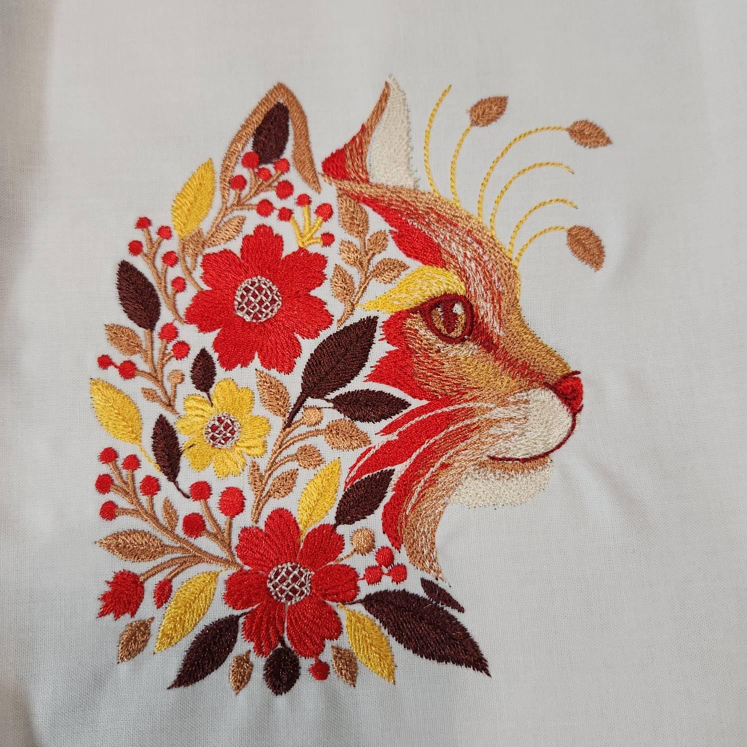 Bring warm, cozy autumn vibes to your projects with this stunning ginger cat machine embroidery design. Rich oranges, copper tones, golden leaves, berries, and textured petals create a luxurious embroidered look that instantly elevates any project.
